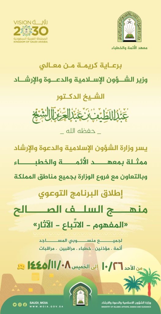 برعاية معالي وزير الشؤون الإسلامية والدعوة والإرشاد الشيخ الدكتور عبداللطيف بن عبدالعزيز آل الشيخ، تطلق الوزارة ممثلة بمعهد الأئمة والخطباء، اليوم، البرنامج التوعوي (منهج السلف الصالح المفهوم والاتباع والآثار)، الذي يستهدف منسوبي المساجد من الخطباء والأئمة والمؤذنين والمراقبين والمراقبات بمختلف مناطق المملكة، ويستمر حتى الثامن من شهر ذو القعدة القادم.