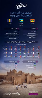 وأكدت الهيئة أن الراغبين من هذه الدول الثلاث بزيارة المملكة واستكشاف وجهاتها السياحية والثقافية الساحرة يمكنهم الحصول على التأشيرة الإلكترونية قبل السفر أو عند الوصول إلى أي من منافذ المملكة الحدودية؛ سواء للسياحة أو لحضور الفعاليات والمعارض والمؤتمرات.