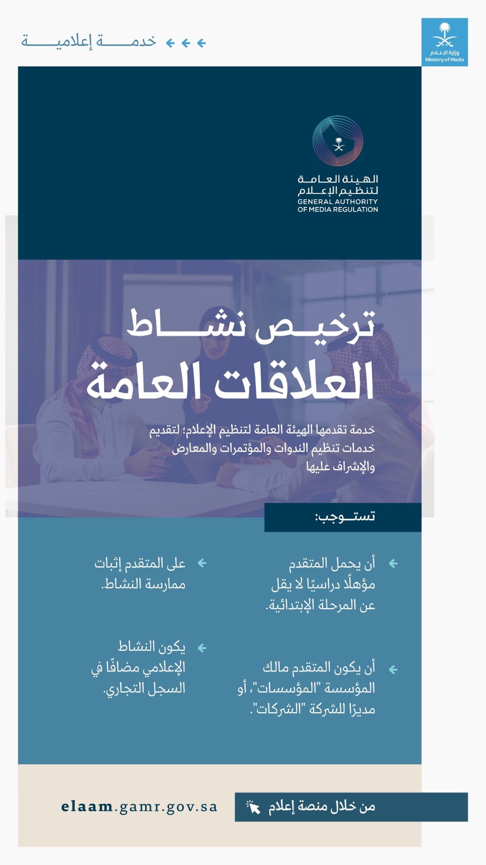 أعلنت الهيئة العامة لتنظيم الإعلام إطلاق خدمة إعلامية جديدة، تتمثل في تقديم الهيئة العامة لتنظيم الإعلام، ترخيصًا لنشاط “العلاقات العامة”، لتقديم خدمات تنظيم الندوات والمؤتمرات والمعارض والإشراف عليها.