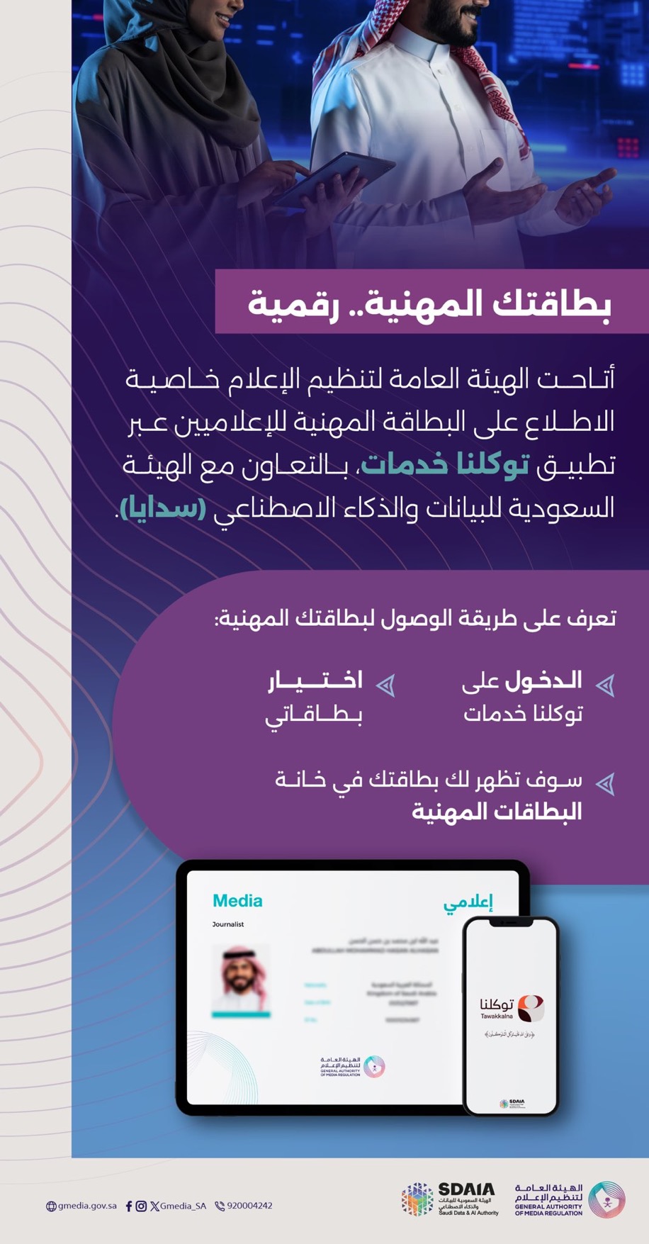 أعلنت الهيئة العامة لتنظيم الإعلام، إطلاق خدمة البطاقات المهنية للإعلاميين المسجلين لدى الهيئة عبر تطبيق “توكلنا”، وذلك بالتنسيق مع الهيئة السعودية للبيانات والذكاء الاصطناعي “سدايا”.