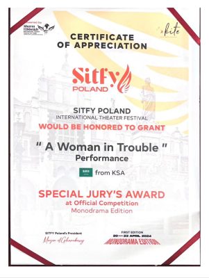 حققت فرقة جوقة المسرح للوطن جائزة لجنة التحكيم الخاصة عن مسرحية مونودراما امرأة في ورطة بعد تجربة مسرحية فريدة في مهرجان نوعي ضم عروض من سلطنة عمان وإيطاليا وإسبانيا ورومانيا وبولندا وكوسوفو، وذلك في الدورة الأولى من مهرجان ستيفي بولندا الدولي للمسرح، والذي اختتم فعالياته مساء أمس في مدينة كراكوف البولندية.