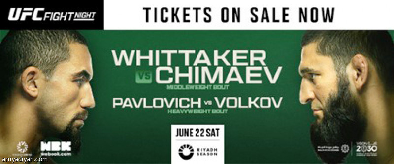 تحتضن الرياض في الـ 22 من يونيو المقبل أول حدث لـ UFC®أبرز منظمة لفنون القتال المختلطة في العالم، حيث يأتي النزال الرئيسي بين المصنف رقم 3 الأسترالي روبرت ويتكر، والنجم الذي لم يهزم المصنف رقم 10، الإماراتي حمزة شيماييف. كما تم طرح تذاكر النزال للجمهور عبر منصة webook .
