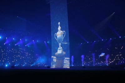ووسط أجواء جماهيرية مختلفة بدأ توافد لاعبي الهلال إلى أرضية ملعب المملكة أرينا وسط تحايا كبيرة لا تتوقف من جماهير الزعيم ، وأخذوا جولة حول مضمار الملعب قبل بدء مراسم حفل التتويج الرسمي.