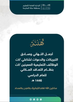 وقدمت إدارة تعليم مكة التهنئة للمعلمين والمعلمات بمناسبة هذا التعيين، وسائلين الله لهم التوفيق والسداد.
