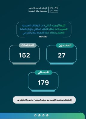 الإدارة العامة للتعليم بمنطقة مكة المكرمة أكدت بأنه يمكن للمعلمين والمعلمات المعينيين الدخول عبر حساباتهم الرسمية في نظام (نور) عن طريق النفاذ الوطني للأطلاع على القرارات الخاصة بهم ومضامينها.