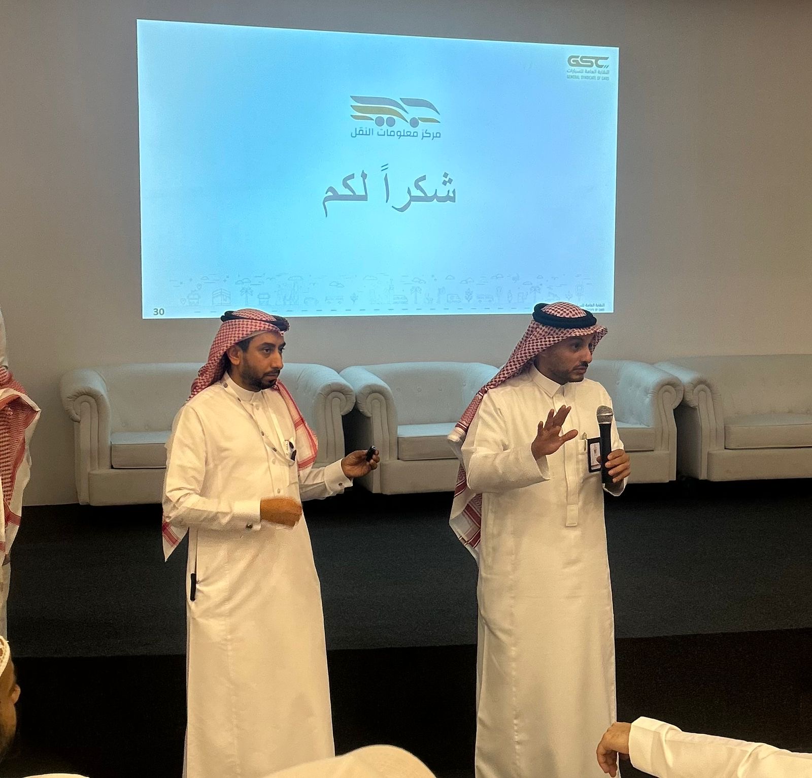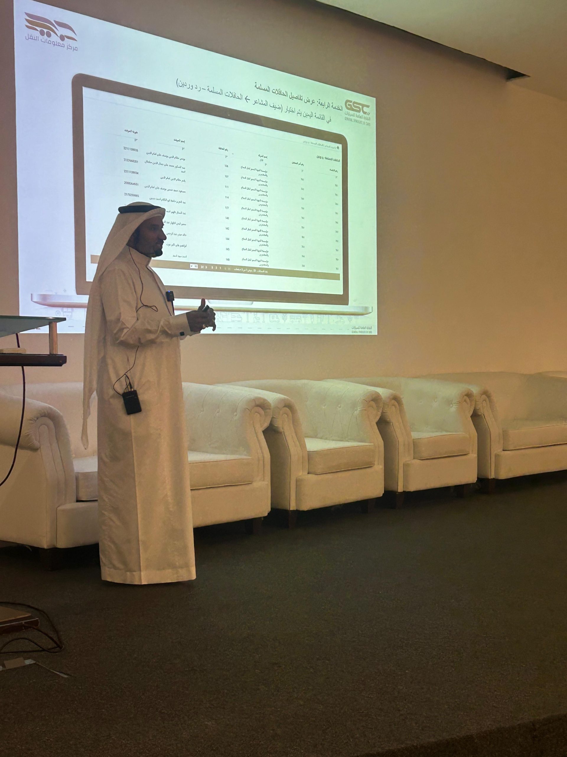 المعاون التقني بإدارة النقل الأستاذ أحمد باجبير شرح آليات ادخال المعلومات للنقل التقليدي والترددي ومراحله وطريقة إرسال أوامر التشغيل واعتماداتها وطريقة إلغاءها ، كما أدار مساحة النقاشات والاسئلة عدد من مسؤولي النقابة .