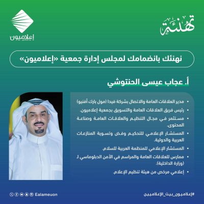 أعلنت جمعية «إعلاميون»، انتخاب الأستاذ عجاب الحنتوشي عضواً في مجلس إدارة الجمعية في دورته الحالية، بعد حصوله على الأصوات المؤهلة لدخول المجلس.