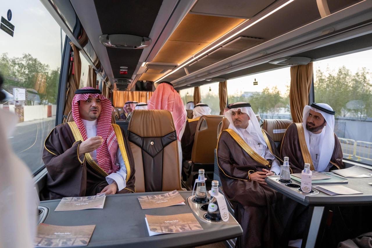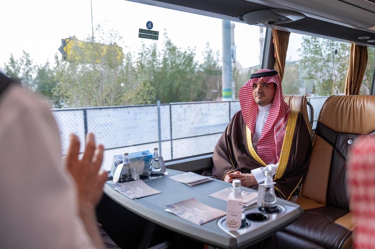 رافق سموه، صاحب السمو الملكي الأمير سعود بن مشعل بن عبدالعزيز نائب أمير منطقة مكة المكرمة نائب رئيس لجنة الحج المركزية، ومعالي وزير الحج والعمرة توفيق بن فوزان الربيعة، ومعالي وزير النقل والخدمات اللوجستية المهندس صالح بن ناصر الجاسر، ومعالي وزير الصحة الأستاذ فهد بن عبدالرحمن الجلاجل، ومعالي وزير الإعلام الأستاذ سلمان بن يوسف الدوسري، ومعالي نائب وزير الداخلية الدكتور ناصر بن عبدالعزيز الداود، ومعالي مساعد وزير الداخلية لشؤون العمليات الفريق أول سعيد بن عبدالله القحطاني، ومعالي مساعد وزير الداخلية الدكتور هشام بن عبدالرحمن الفالح، ومعالي نائب وزير الحج والعمرة الدكتور عبدالفتاح بن سليمان مشاط، ومعالي مستشار رئيس أمن الدولة الأستاذ أحمد الثقفي، ومعالي وكيل وزارة الداخلية الدكتور خالد بن محمد البتال، ومعالي وكيل وزارة الداخلية للشؤون الأمنية الأستاذ محمد بن مهنا المهنا، ومعالي مدير عام المباحث العامة الأستاذ أحمد بن عبدالعزيز العيسى، ومعالي مدير الأمن العام الفريق محمد بن عبدالله البسامي، ومدير الدفاع المدني المكلف اللواء الدكتور حمود بن سليمان الفرج، ووكيل وزارة الحج والعمرة لشؤون الحج عائض الغوينم، والرئيس التنفيذي للهيئة الملكية لمدينة مكة المكرمة والمشاعر المقدسة المهندس صالح بن إبراهيم الرشيد، والرئيس التنفيذي لشركة كدانة للتنمية والتطوير المهندس محمد بن ناصر المجماج.