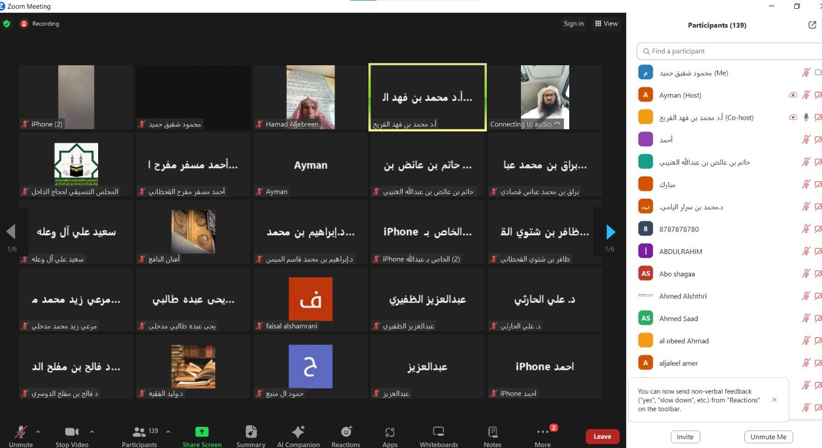 نظمت وزارة الشؤون الإسلامية والدعوة والإرشاد ممثلة بالأمانة العامة للتوعية الإسلامية في الحج بالتعاون مع المجلس التنسيقي لشركات ومنشآت خدمة حجاج الداخل “متحد” اليوم الإثنين الرابع من شهر ذي الحجة لعام 1445هـ، لقاء تعريفياً بعنوان: “اللقاء التعريفي للدعاة المشاركين في شركات ومنشآت خدمة حجاج الداخل” عبر تطبيق زووم.