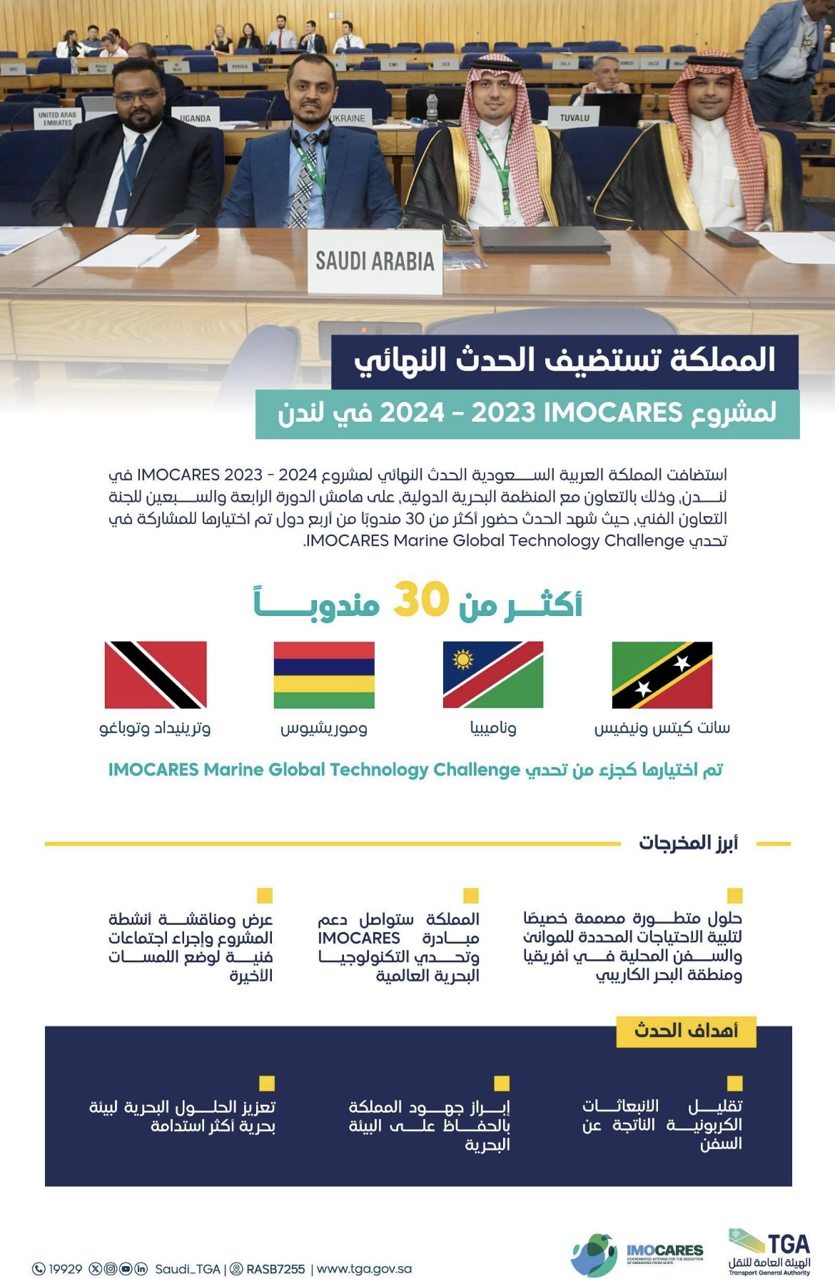 استضافت المملكة الحدث النهائي لمشروع IMOCARES 2023 – 2024 في لندن وذلك بالتعاون مع المنظمة البحرية الدولية على هامش الدورة الرابعة والسبعين للجنة التعاون الفني بحضور أكثر من 30 مندوبًا من أربع دول تم اختيارها للمشاركة في تحدي IMOCARES Marine Global Technology Challenge وتضمن الحدث مشاركة 4 دول في المشروع (سانت كيتس ونيفيس وناميبيا وموريشيوس وترينيداد وتوباغو) حيث يمثل ختامًا لمشروع IMOCARES الممول بالكامل من قبل المملكة وذلك في إطار جهودها لتعزيز التعاون بين شمال وجنوب العالم لتحقيق أهداف المنظمة البحرية الدولية لإزالة الكربون من الغازات الدفينة ، كما اشتمل على عدد من العروض التقديمية وحدثًا جانبيًا بعنوان “الشحن المحلي وإزالة الكربون في المناطق النامية” والذي جمع بين خبراء الصناعة وأصحاب المصلحة لمناقشة القضايا الرئيسية في الصناعة البحرية وتعتزم المملكة مواصلة دعمها لمبادرات مثل IMOCARES وتحدي التكنولوجيا البحرية العالمية والتي تهدف إلى جمع البلدان معًا للعمل على مستقبل أكثر استدامة ، معززًا من ابتكار الحلول التعاونية للتحديات الكبرى التي تواجه القطاع البحري ويضمن التكامل في العمل نحو إزالة الكربون ، يذكر أن تحدي IMOCARES Marine Global Technology Challenge الذي تنظمه المنظمة البحرية الدولية (IMO) يمثل مسابقة رائدة تستهدف مزودي التكنولوجيا البحرية في جميع أنحاء العالم حيث تساهم في تشجيع المشاركين على تقديم حلول مبتكرة تلبي الاحتياجات المحددة للموانئ والسفن المحلية في أفريقيا ومنطقة البحر الكاريبي .