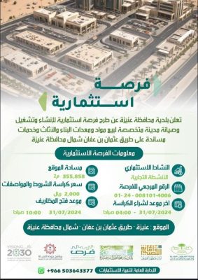 أعلنت أمانة منطقة القصيم ممثلة ببلدية محافظة عنيزة، عن طرح فرصة استثمارية، أمام منشآت القطاع الخاص، تتمثل في إنشاء وتشغيل وصيانة مدينة متخصصة لبيع مواد ومعدات البناء والأثاث وخدمات مساندة على طريق عثمان بن عفان شمال محافظة عنيزة، على مساحة 355,858م2، عبر بوابة الاستثمار في المدن السعودية “فرص”، داعيةً المستثمرين الراغبين في التنافس الاطلاع على الفرصة، وتفاصيل المنافسة من خلال تطبيق الاستثمار البلدي (فرص)