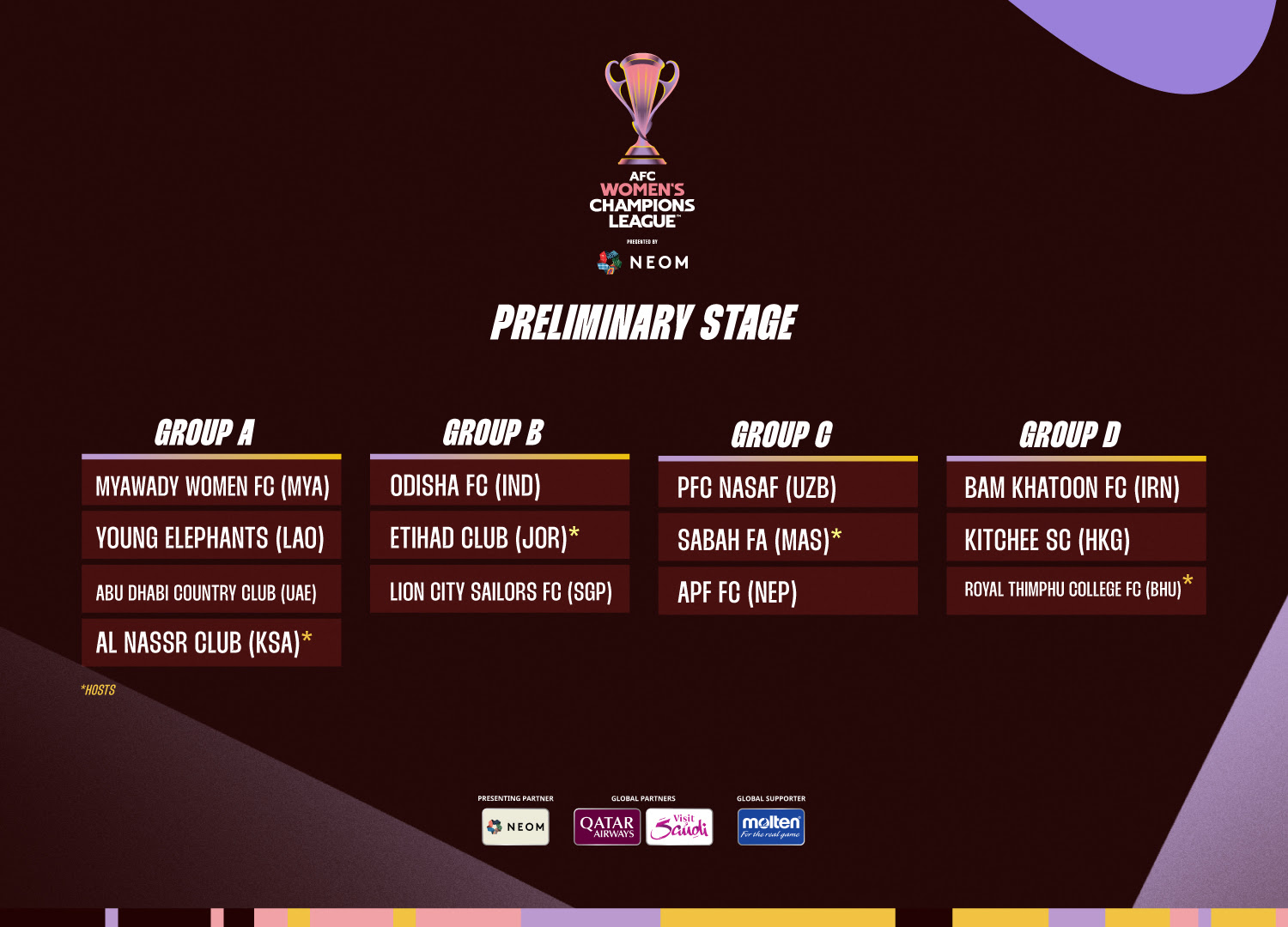 وأوقعت قرعة الدور التمهيدي نادي مياوادي من ميانمار في المجموعة الأولى إلى جانب يونغ ايلفانتس من لاوس، وأبو ظبي الإماراتي، والنصر السعودي المضيف.