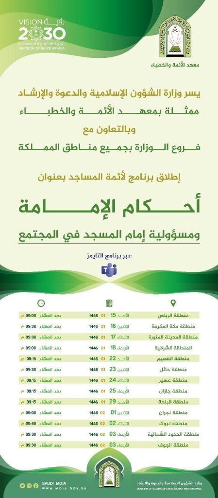 تطلق وزارة الشؤون الإسلامية والدعوة والإرشاد، ممثلة بمعهد الأئمة والخطباء، برنامج (أحكام الإمامة ومسؤولية إمام المسجد في المجتمع)، وذلك “عن بعد” عبر برنامج “التايمز”، حيث ينطلق يوم الأحد القادم الخامس عشر من شهر محرم الجاري ويستمر إلى الثالث من شهر صفر القادم.