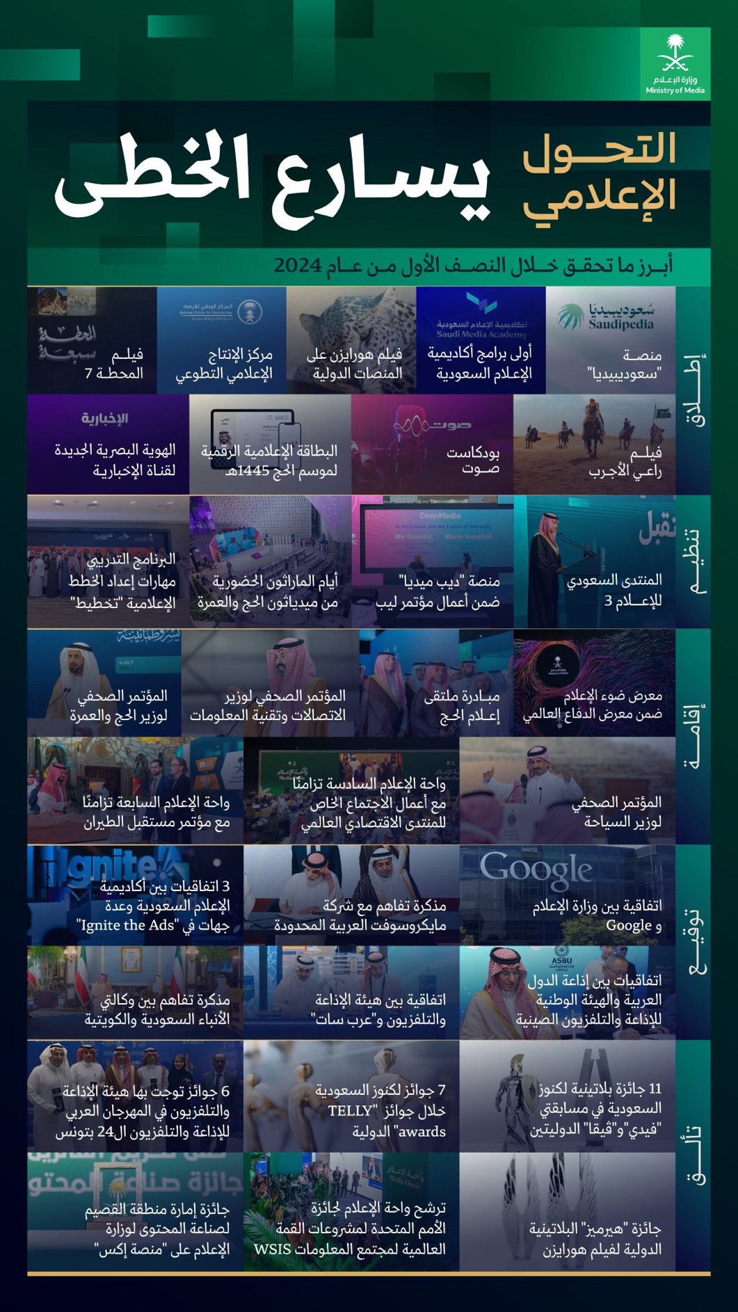 كما تم خلال النصف الأول من عام التحول الإعلامي، إقامة معرض ضوء الإعلام ضمن معرض الدفاع العالمي، ومبادرة ملتقى إعلام الحج، والمؤتمر الصحفي لوزير الاتصالات وتقنية المعلومات، وكذلك المؤتمر الصحفي لوزير الحج والعمرة، إضافة إلى المؤتمر الصحفي لوزير الإعلام، وواحة الإعلام السادسة تزامنا مع أعمال الاجتماع الخاص للمنتدى الاقتصادي العالمي، وواحة الإعلام السابعة تزامنا مع مؤتمر مستقبل الطيران.