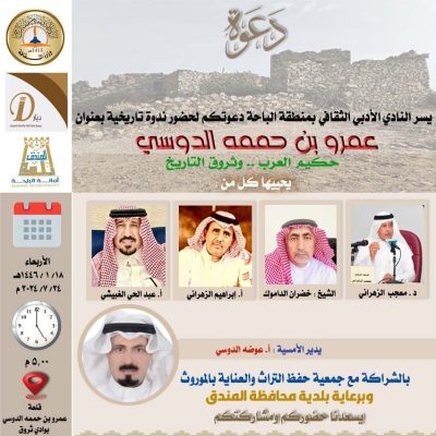 الباحة – يقيم نادي الباحة الأدبي الثقافي بالشراكة مع جمعية ديار لحفظ التراث والعناية بالموروث مساء الإربعاء ١٤٤٦/١/١٨، ندوة بعنوان : عمرو بن حممة الدوسي حكيم العرب – وثروق التاريخ عند الساعة الخامسة مساءً بجوار قصر عمرو بن حممة الدوسي في وادي ثروق التاريخي بدوس وسيشارك فيها كلاً من: الدكتور معجب بن سعيد الزهراني والشيخ خضران بن فراج الداموك والأستاذ إبراهيم بن يحيى الزهراني والأستاذ عبدالحي الغبيشي ويديرها الأستاذ عوضة الدوسي يروي المتحدثون من خلالها جوانب ثرية من تاريخ وادي ثروق ومواقف وحكايات من سيرة حكيم العرب وشاعرها عمرو بن حممة الدوسي.
