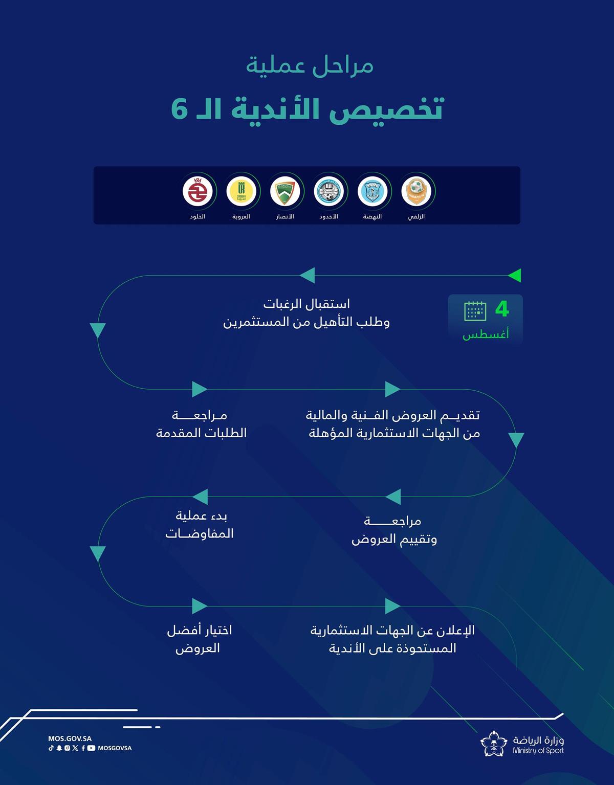 وتمر عملية تخصيص الأندية الستة بعددٍ من المراحل إلى حين استكمال إغلاقها التجاري ونقل ملكيتها، حيث تنطلق باستقبال الرغبات وطلب التأهيل من المستثمرين عبر بوابة “المستثمرين” في موقع المركز الوطني للتخصيص، وتنتهي بتاريخ 19 سبتمبر 2024م، عند الساعة 4 مساءً (بتوقيت السعودية)، يعقبها استكمال مراجعة الطلبات، ثم انطلاق مرحلة تقديم العروض المالية والفنية من قبل الجهات التي تمت الموافقة عليها ومراجعتها وتقييمها، لتبدأ بعد ذلك عملية التفاوض الرسمية، واختيار أفضل العروض المقدمة، ثم الإعلان عن الجهات الاستثمارية المستحوذة على ملكية الأندية الستة.