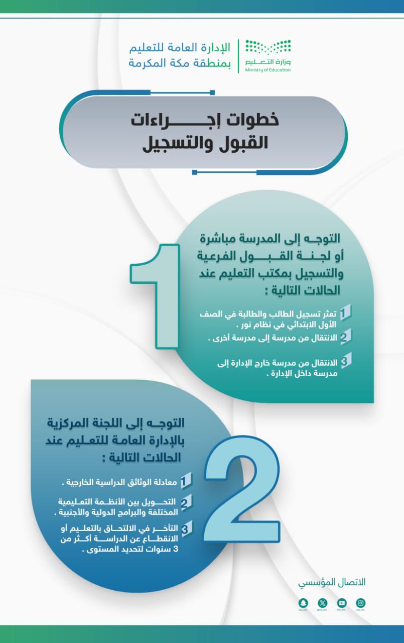 حيث تبدأ رحلة ولي الأمر للتسجيل الطلبة بالتوجه إلى المدرسة مباشرةً، أو التوجه إلى لجنة القبول والتسجيل الفرعية بمكتب التعليم عند الحالات التالية: تعثر تسجيل الطالب والطالبة في الصف الأول الابتدائي، الانتقال من مدرسة إلى مدرسة أخرى، الانتقال من مدرسة خارج الإدارة إلى مدرسة داخل الإدارة.