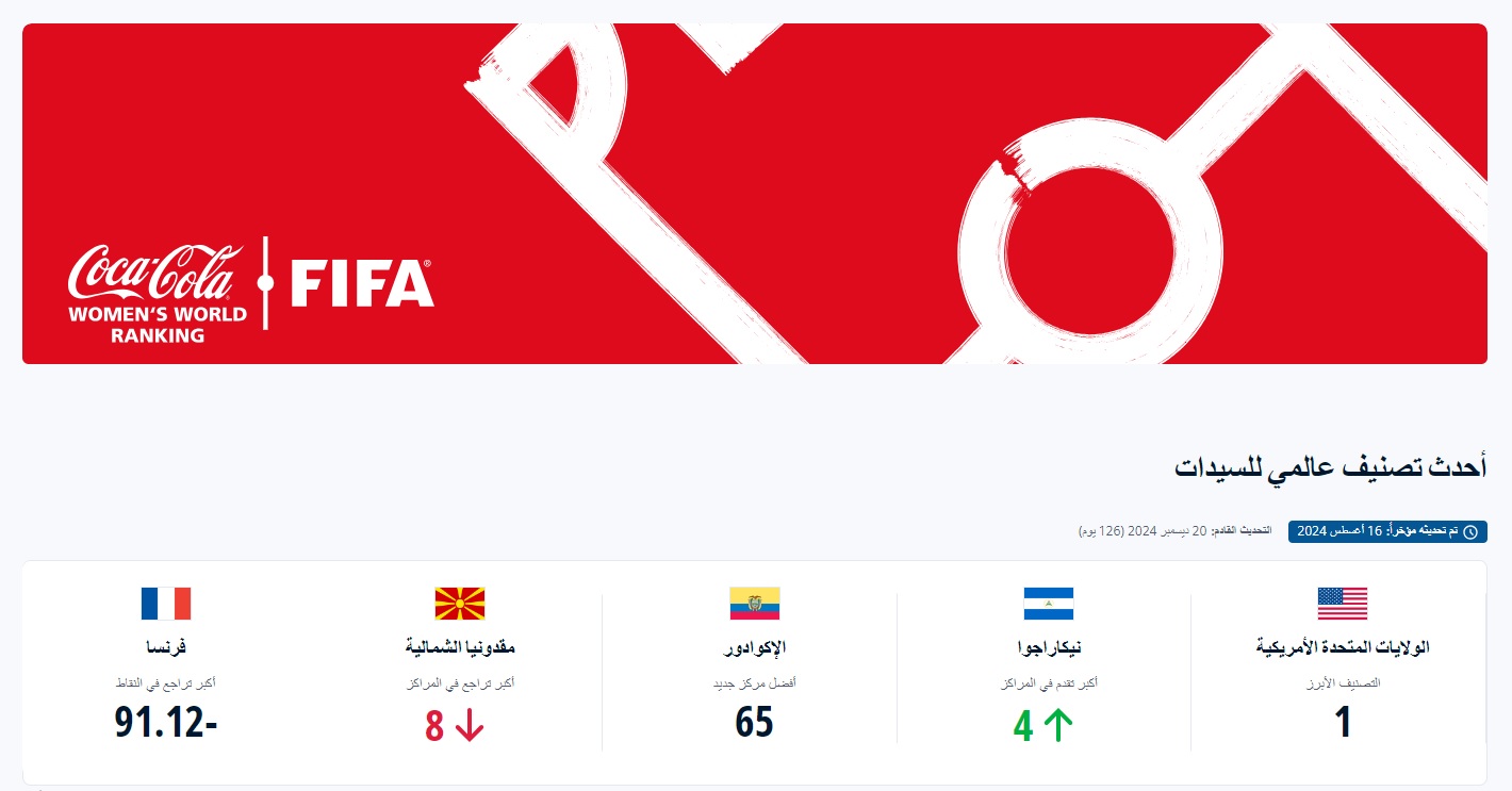 ستصدر النسخة المقبلة من التصنيف العالمي للسيدات FIFA/Coca-Cola بتاريخ 20 ديسمبر/كانون الأول 2024.