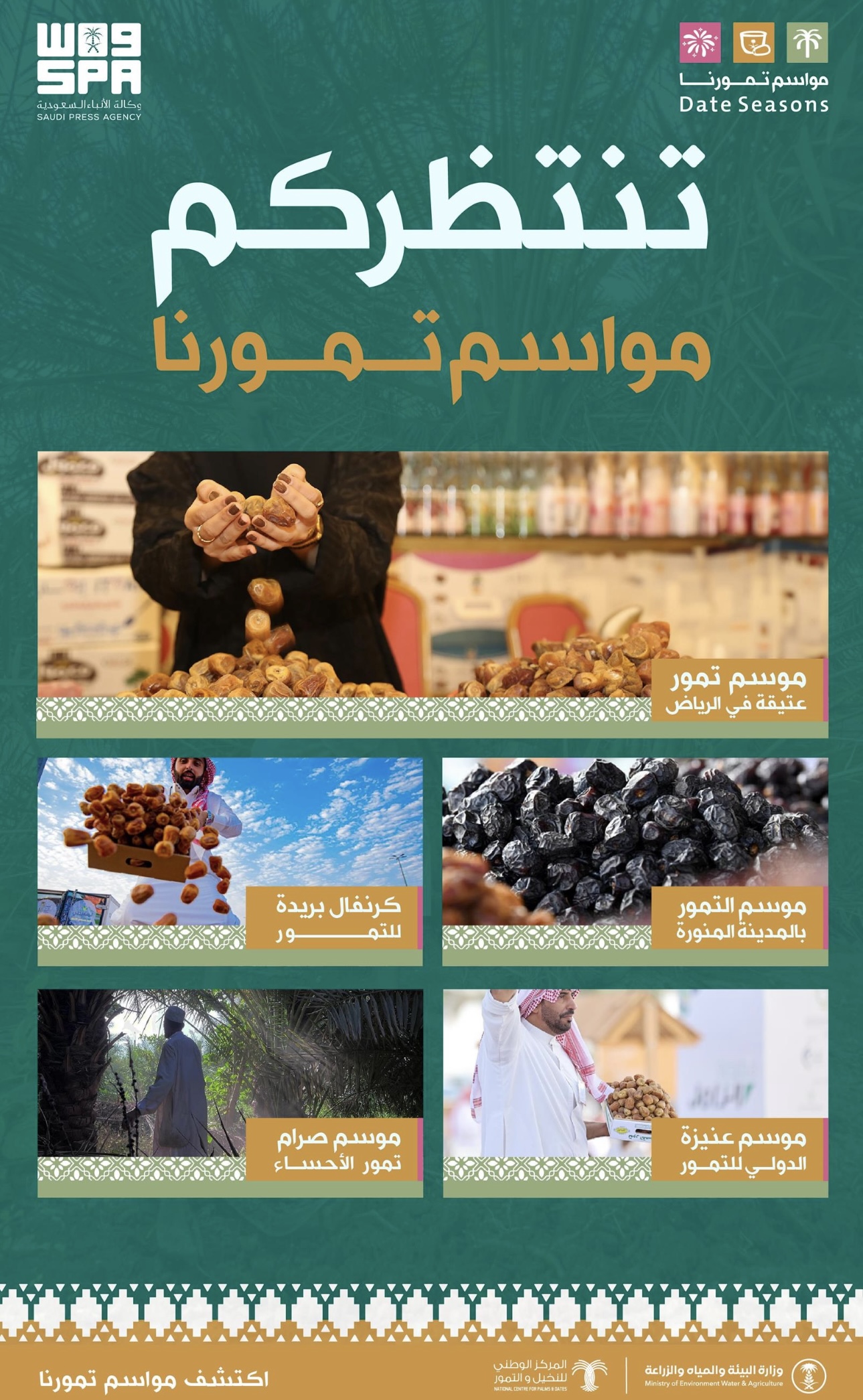 أطلق المركز الوطني للنخيل والتمور “مواسم تمورنا” باعتبارها الحدث الموسمي الذي يغمر مدن المملكة المنتجة للتمور عبر فعاليات تراثية وثقافية مصاحبة لأسواق التمور في جميع مناطق المملكة حيث تستهدف المجتمع المحلي والزوار والسياح المحليين والدوليين وذلك لتعزيز القيمة الاقتصادية والمكانة الاجتماعية للتمور وتهدف “مواسم تمورنا” إلى ترسيخ ارتباط التمور بالإرث الثقافي والاجتماعي في المملكة باعتبار التمور تاريخًا ممتدًا ومكوّنًا عميقًا للهوية السعودية ورمزًا للكرم والضيافة وفي الجانب ذاته تعمل “مواسم تمورنا” على الاستثمار الأمثل لتحقيق أعلى مستويات الرضى للمزارع والمسوق والمشتري عطفًا على الإيجابيات التي ستحققها المواسم لاقتصاد المنطقة والمملكة وذلك عبر تطبيق “نظام الأسواق الموسمية” الذي يُعد نظامًا إلكترونيًا يهدف إلى ضبط وتنظيم حركة تداول التمور لرفع كفاءة وجودة أسواق التمور الموسمية وأكد الرئيس التنفيذي للمركز الوطني للنخيل والتمور الدكتور محمد النويران أن “مواسم تمورنا” تعمل على تعزيز عوامل جذب القوة الشرائية لأسواق التمور في مختلف مناطق المملكة إضافةً إلى رفع مؤشرات التصاعد النوعي والكمي بأن يكون المنتج الوطني من تمور المملكة منتجًا اقتصاديًا عبر حوكمة الأسواق بأنظمة حديثة وقدم الدكتور النويران شكره وتقديره إلى أصحاب السمو أمراء المناطق ومعالي وزير البيئة والمياه والزراعة – رئيس مجلس إدارة المركز الوطني للنخيل والتمور- على الدعم المتواصل لقطاع النخيل والتمور في المملكة وتمكين المركز في كل ما من شأنه الارتقاء بهذا القطاع الهام كما قدم شكره لجميع الجهات الحكومية والشركاء وأصحاب المصلحة ” المزارعين والمسوقين والمشترين” في تعاونهم نحو تحقيق الأهداف المرجوة وعلى صعيد متصل أطلق المركز الوطني للنخيل والتمور مؤخرًا “نظام الأسواق الموسمية” الذي يعد نظامًا إلكترونيًا إلزاميًا يهدف إلى ضبط وتنظيم حركة تداول التمور في الأسواق الموسمية بهدف رفع كفاءة وجودة بيانات الأسواق في جميع مناطق المملكة ويشترط التسجيل فيه للتمكن من بيع أو شراء أو تسويق التمور بداخل أسواق التمور الموسمية .