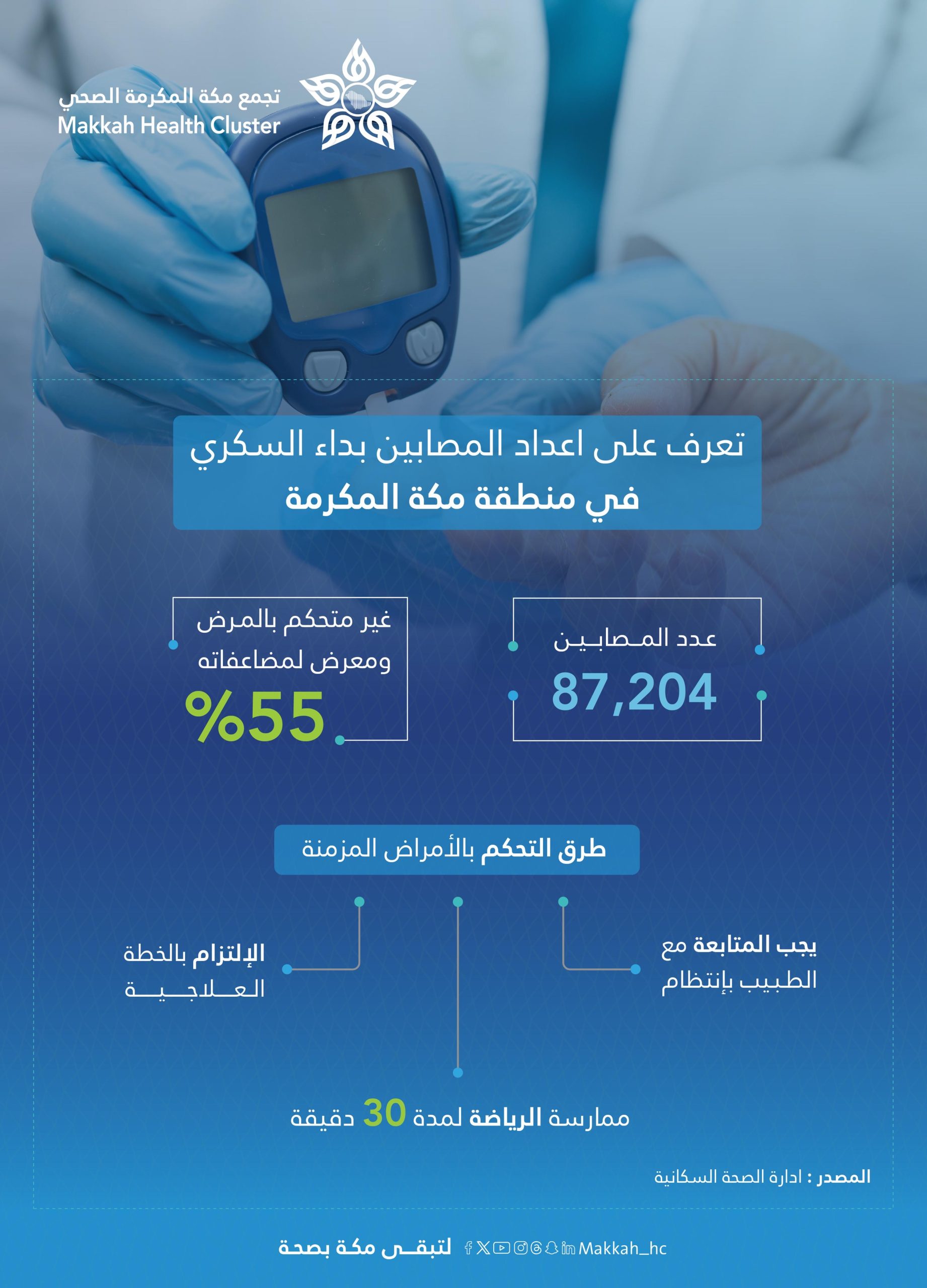 أظهرت إحصائية حديثة صادرة عن إدارة الصحة السكانية بتجمع مكة المكرمة الصحي، أن عدد المصابين بداء السكري بمنطقة مكة المكرمة 87.204 شخص مصاب، 55% منهم غير متحكم بالمرض ومعرض لمضاعفاته.