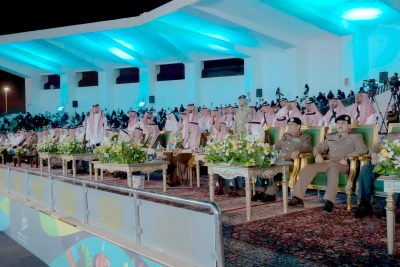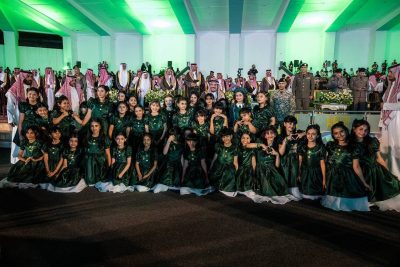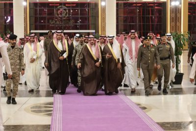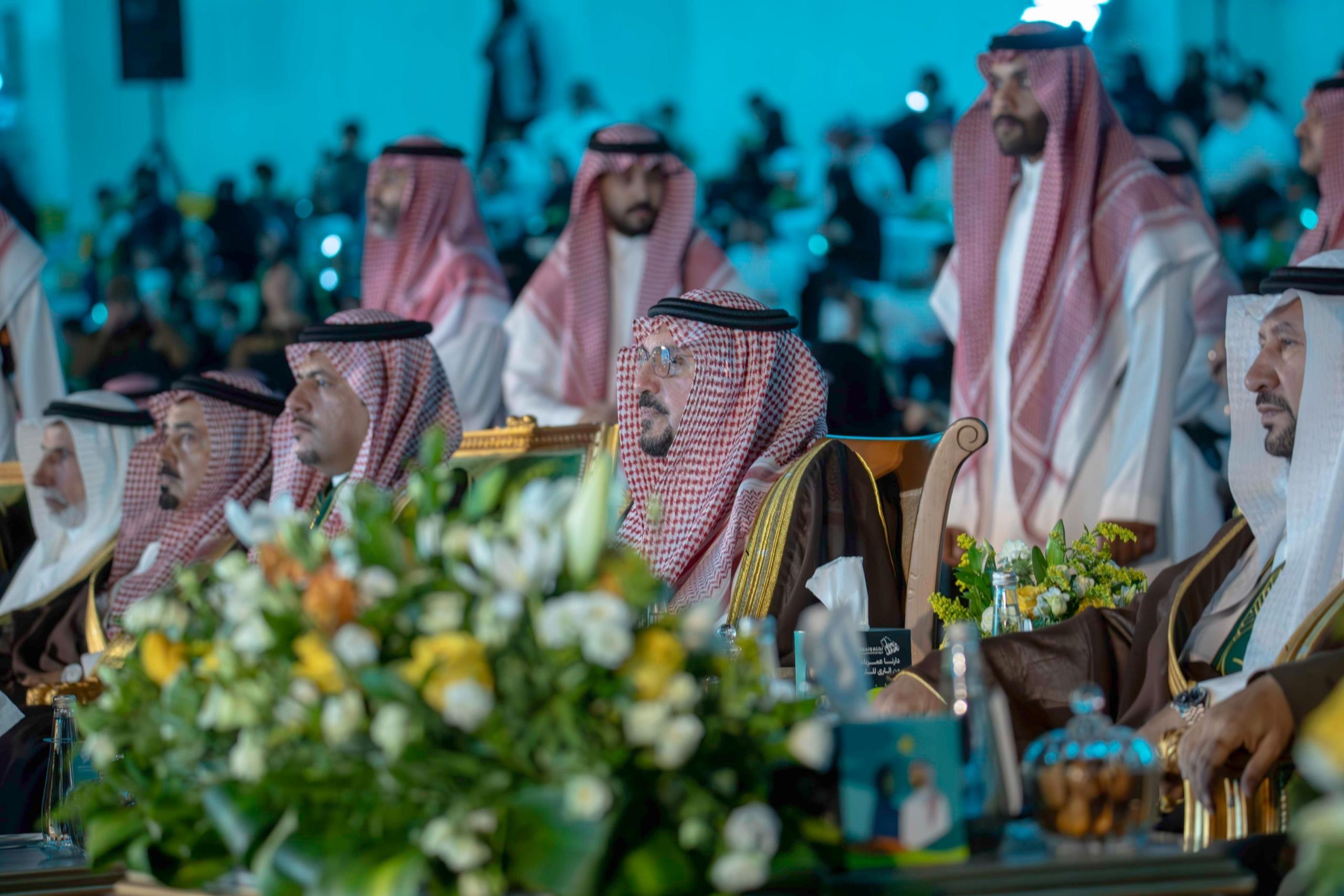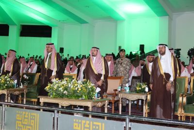 وأشاد سموه بما شاهده من لوحات وصور وطنية في هذه المناسبة الغالية، كما شارك سموه في العرضة السعودية.