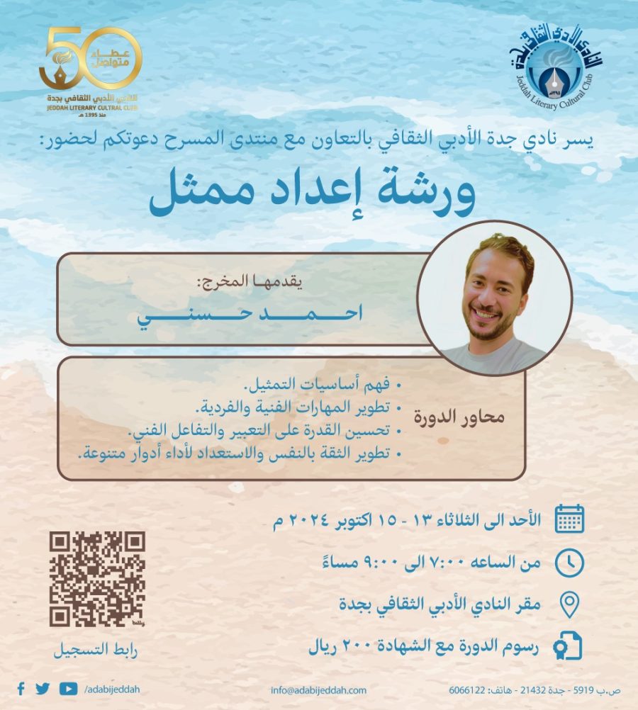 يقيم النادي الأدبي الثقافي بجدة الأحد 13 أكتوبر 2024م وذلك ضمن فعاليات منتدى المسرح ورشة تدريبية بعنوان (ورشة إعداد ممثل) يقدمها المخرج احمد حسني، وتستمر لمدة ثلاثة أيام من السابعة حتى التاسعة مساءً بقاعة مكتبة النادي.