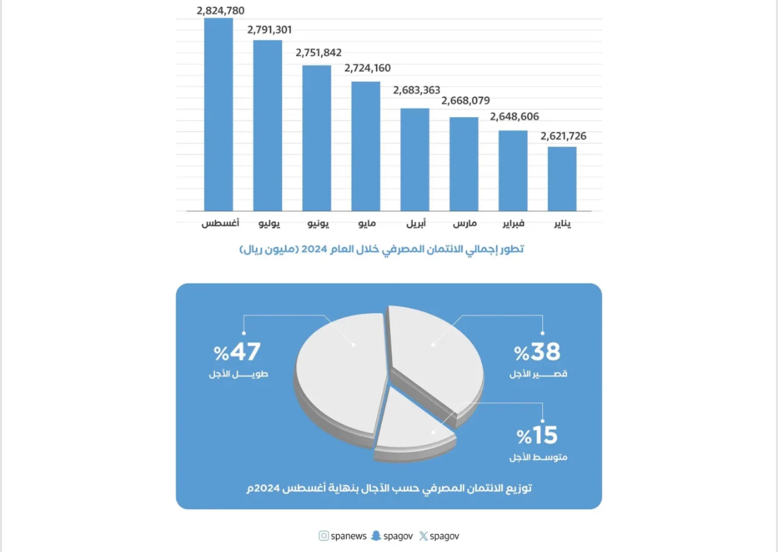 حقق الائتمان المصرفي الممنوح للقطاعين العام والخاص في المملكة مستويات قياسية تُعد الأعلى تاريخيًا بنهاية شهر أغسطس 2024م ليبلغ نحو 2,824,780 مليون ريال، بنسبة نمو سنوية تُقدر بـ 12.1%، بزيادة بلغت نحو 305,023 مليارات ريال، مقارنة بـ 2,519,756 مليون ريال لنفس الفترة المماثلة من العام السابق.