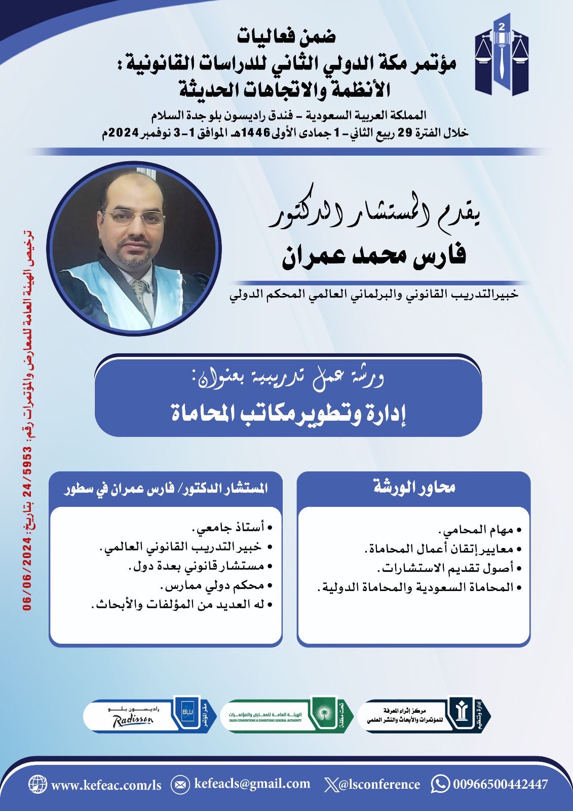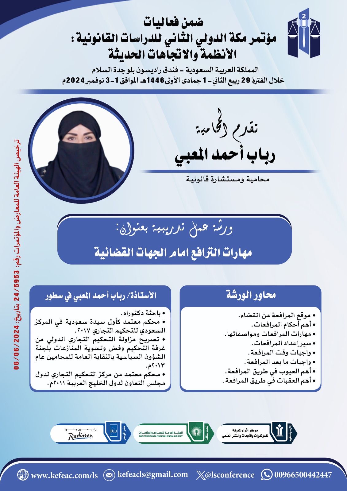ضمن أطار إبراز الجهود العلمية الحديثة في دراسات القانون والأنظمة، تنطلق فعاليات مؤتمر مكة الدولي الثاني للدراسات القانونية: الأنظمة والاتجاهات الحديثة، بفندق فندق راديسون بلو السلام جدة خلال الفترة 29ربيع الثاني- 01 جمادى الأولى 1446 الموافق 1-3 نوفمبر 2024م.