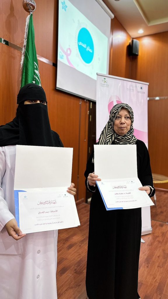 محاضرة وحملة توعوية عن سرطان الثدي تحت “شعار رايتك وردية” وذلك في مسرح ريادة الأعمال بشطر الطالبات.