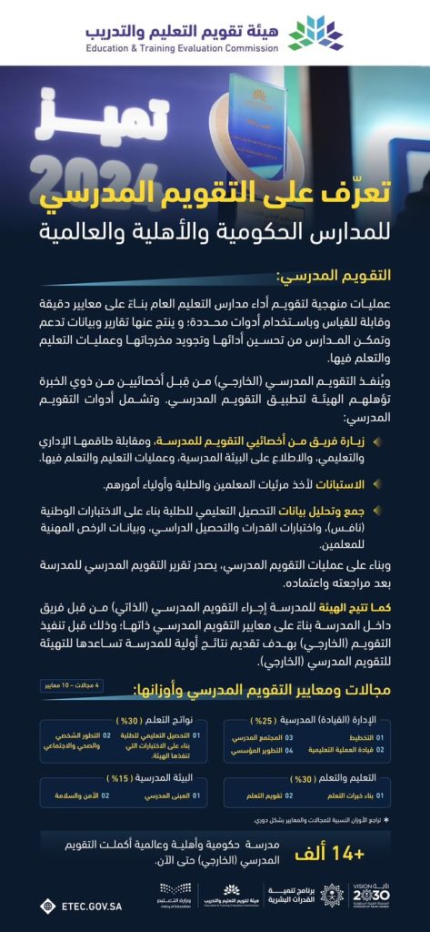 في عام 2024، تم تكريم 292 مدرسة حققت مستوى التميز في الملتقى الوطني للتميز المدرسي، وهي الدفعة الأولى التي أكملت التقييم المدرسي الخارجي. يهدف البرنامج إلى تحسين جودة التعليم من خلال معايير دقيقة وقابلة للقياس، باستخدام أدوات تشمل زيارات ميدانية للمدارس يجريها فريق من الاختصاصيين المؤهلين من قِبل الهيئة.
