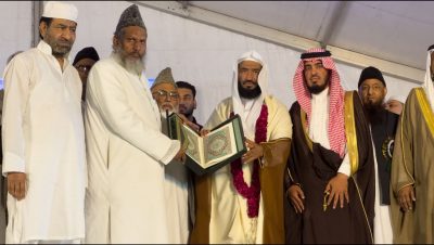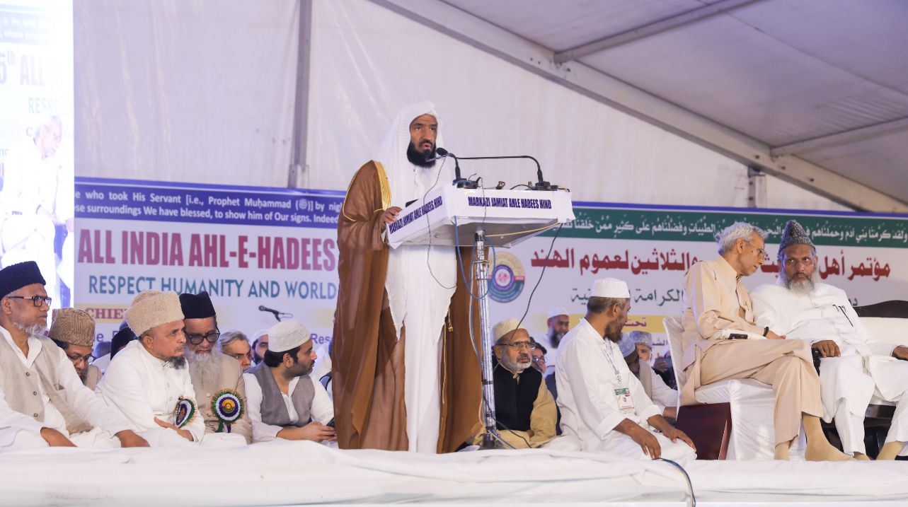 إثر ذلك بدأ الحفل بتلاوة آيات من الذكر الحكيم ، ثم ألقى فضيلة رئيس جمعية أهل الحديث المركزية لعموم الهند ، الشيخ اصغر علي إمام مهدي السلفي كلمة قال فيها: “أصالة عن نفسي ونيابة عن جميع مسلمي الهند ، نرحب بإمام وخطيب المسجد النبوي الشريف الشيخ الدكتور عبدالله البعيجان ، في بلده الثاني جمهورية الهند ، مؤكداً ان جميع من حضروا هذا المؤتمر متطلعين للقاء فضيلته والاستماع لكلماته والصلاة خلفه ، مشيداً بالارتباط القوي بين جمهورية الهند والمملكة العربية السعودية منذ عهد المؤسس الملك عبدالعزيز -طيب الله ثراه- وامام الدعوة السلفية شيخ الإسلام محمد بن عبدالوهاب رحمه الله في مناصرة الدين الإسلامي والعقيدة الصحيحة والاعتماد على الكتاب والسنة في فهم السلف الصالح .