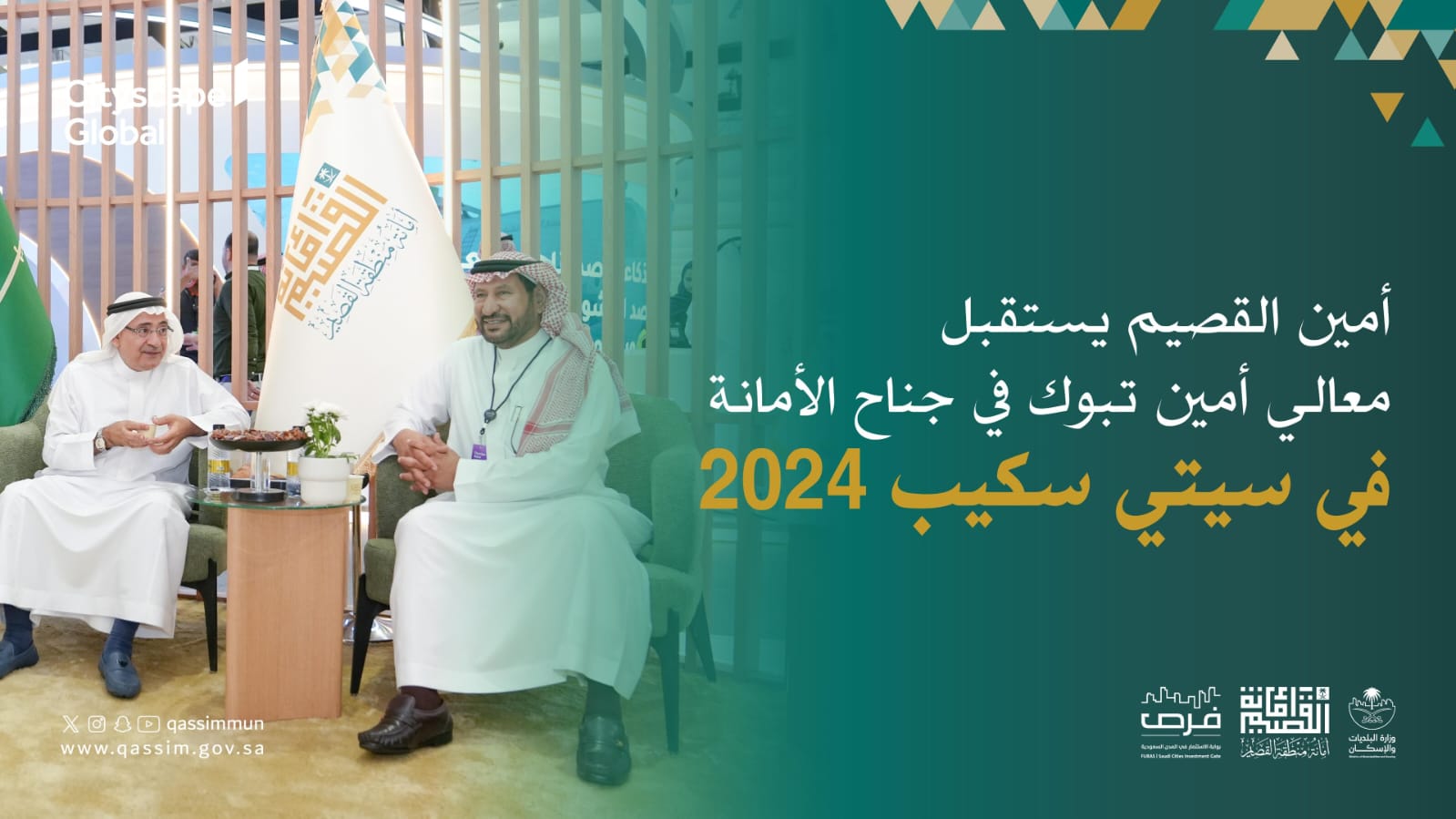 استقبل أمين منطقة القصيم، المهندس محمد بن مبارك المجلي، معالي أمين منطقة تبوك، المهندس حسام اليوسف، في جناح أمانة منطقة القصيم المشارك في معرض سيتي سكيب العالمي 2024، الذي يُقام في مركز الرياض الدولي للمعارض والمؤتمرات بملهم.
