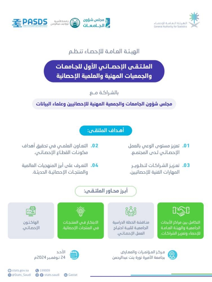 يذكر أن الملتقى الإحصائي للجمعات والجمعيات يأتي ضمن إطار جهود الهيئة العامة للإحصاء المستمرة في تعزيز المعرفة العلمية الإحصائية، وإطلاق المبادرات التي تُسهم في رفع مستوى الثقافة الإحصائية في المجتمع بما يضمن استدامة الوعي بأهمية البيانات والمؤشرات الإحصائية، ودورها الحيوي في دعم وتمكين صناع القرار وراسمي السياسات لوضع خطط التنمية المستدامة خلال السنوات القادمة على أسس علمية صحيحة تستند إلى ما هو موجود في بالفعل من حقائق في أرض الواقع.