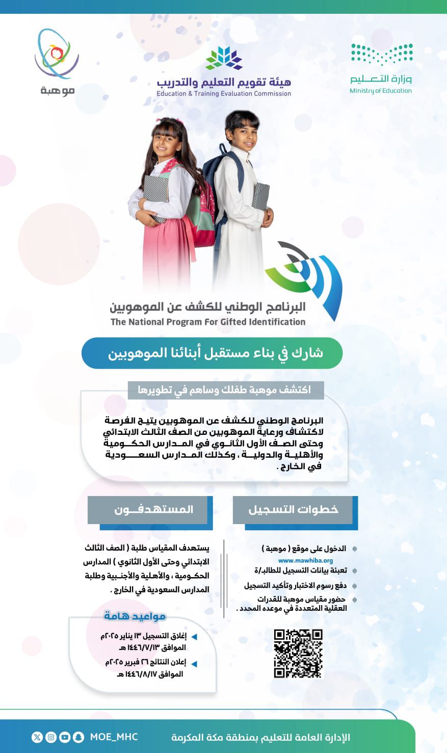 أعلنت الإدارة العامة للتعليم بمنطقة مكة المكرمة عن استمرار التسجيل في البرنامج الوطني للكشف عن الموهوبين حتى تاريخ 13 / 7 / 1446 هـ ، وإعلان النتائج في تاريخ 17 / 8 / 1446 هـ .