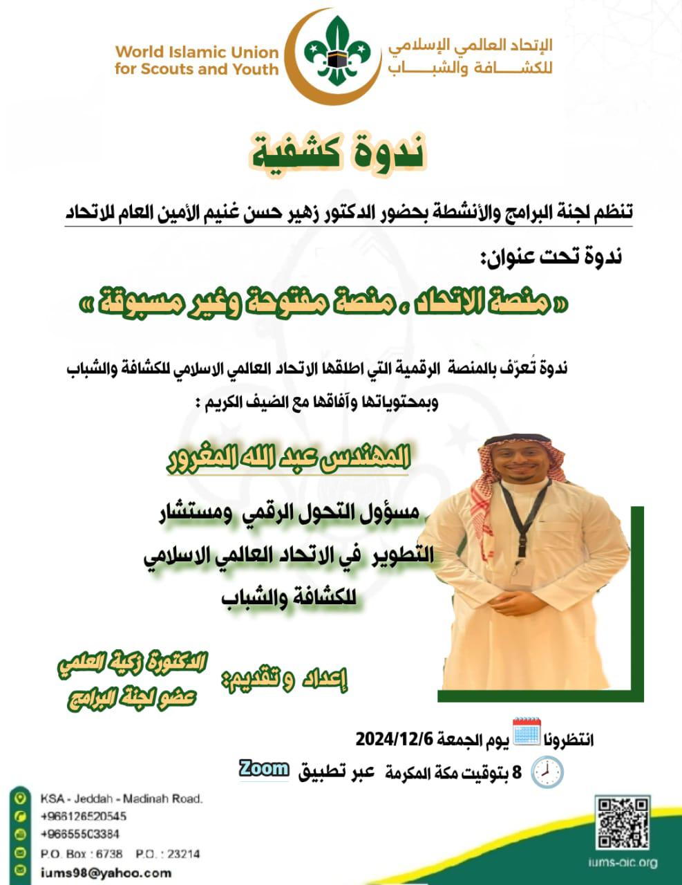تُنظم لجنة البرامج والأنشطة بالاتحاد العالمي الإسلامي للكشافة والشباب ندوة كشفية بعنوان : منصة الاتحاد منصة مفتوحة وغير مسبوقة بحضور الأمين العام للاتحاد سعادة الدكتور زهير بن حسين غنيم وسنتعرف خلال الندوة بالمنصة الرقمية التي أطلقها الاتحاد العالمي الإسلامي للكشافة والشباب ومحتوياتها وأفاقها وتستضيف الندوة المهندس عبدالله المغرور مسؤول التحول الرقمي في الاتحاد العالمي الإسلامي للكشافة والشباب وتعقد الندوة مساء الجمعة 6/12/2024 الساعة 8 مساءً بتوقيت مكة المكرمة عبر منصة الزووم وهذه الندوة من إعداد وتقديم الدكتورة زكية العلمي عضو لجنة البرامج .