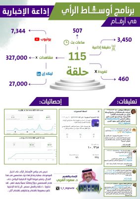 وشارك في البرنامج أكثر من ٢٣٠ ضيف من الخبراء في مختلف المجالات من السعوديين والسعوديات المتخصصين في الموضوعات التي يناقشها البرنامج، وحقق مشاهدات على جميع منصات التواصل تفوق 354 ألف مشاهدة، وعلى قناة اليوتوب 7344 مشاهدة، وبلغت ساعات البث أكثر 507 ساعات بعدد دقائق يصل إلى نحو أربعة آلاف دقيقة، و460 تغريدة على منصة X فقط، تتضمن الإعلان عن حلقات البرنامج ومقاطع صوتية لضيوفه.