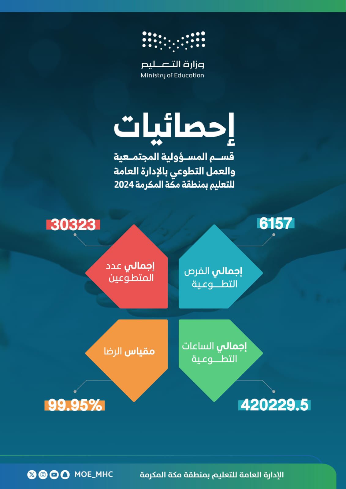 الجدير ذكره أن تعليم مكة حقق أكثر من 400 ألف ساعة تطوعية فيما بلغ عدد المتطوعين 30323 متطوع لـ 6157 فرصة تطوعية .