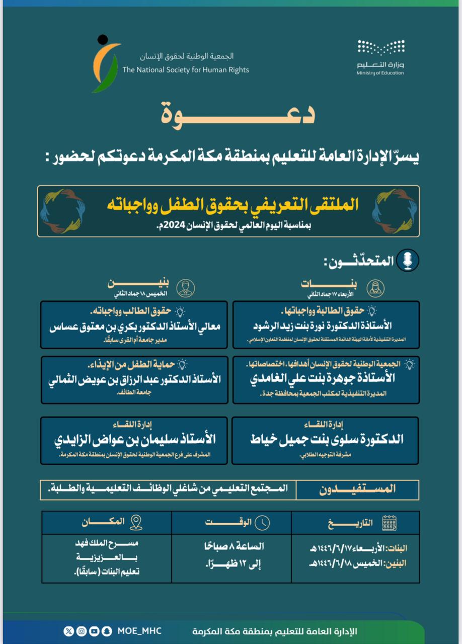 انطلق في الإدارة العامة للتعليم بمنطقة مكة المكرمة اللقاء التعريفي بحقوق الطفل وواجباته وذلك تزامناً مع اليوم العالمي لحقوق الإنسان 2024م.