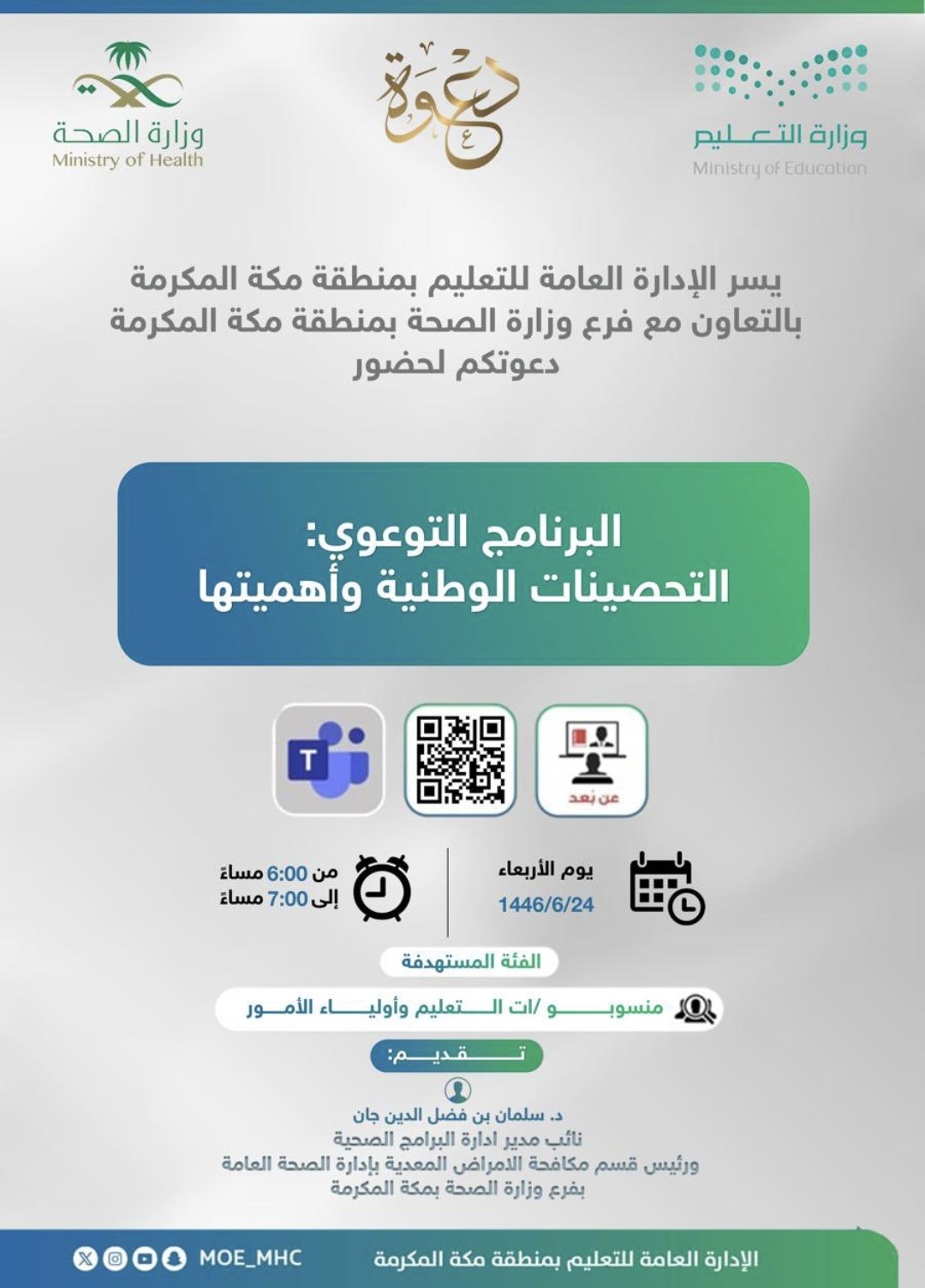تعتزم الادارة العامة للتعليم بمنطقة مكة  المكرمة وبالتعاون مع فرع وزارة الصحة بمنطقة مكة المكرمة ؛ تنفيذ البرنامج التوعوي الصحي بعنوان ” التحصينات الوطنية وأهميتها ” وذلك مساء بعد غدا  الأربعاء 24 / 6 / 1446 هـ. من الساعة 6م ولغاية 7 م عبر برنامج zoom عن بعد.