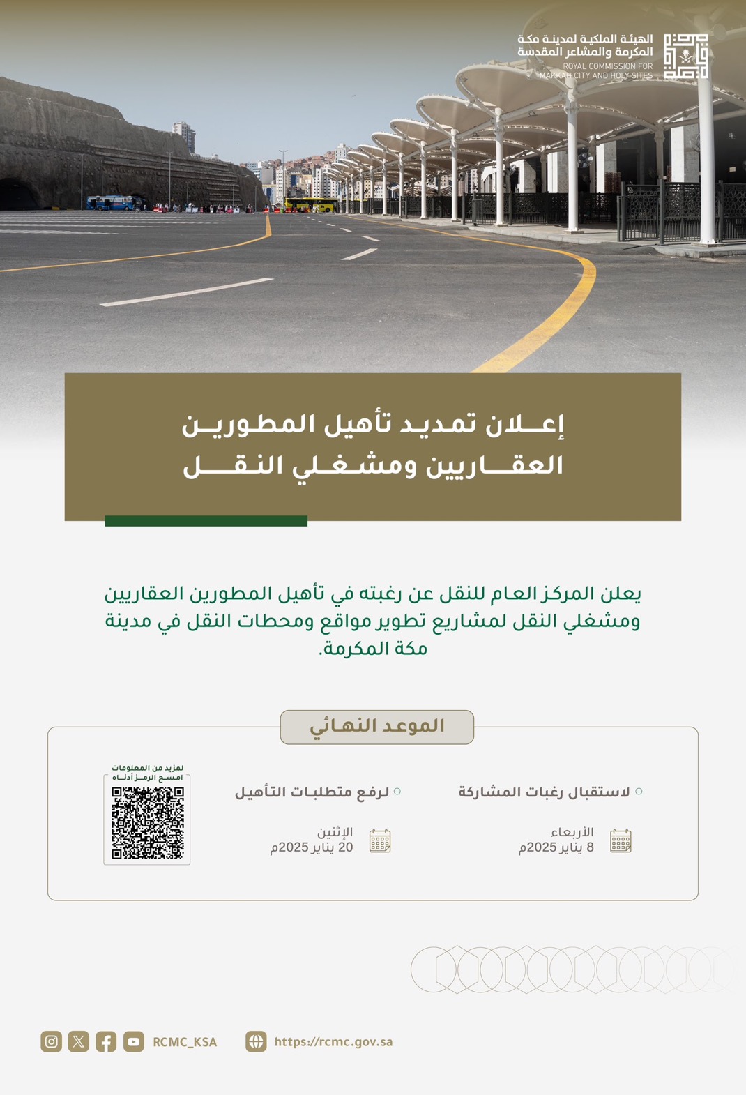 أعلنت الهيئة الملكية لمدينة مكة المكرمة والمشاعر المقدسة ممثلة في مركز النقل العام عن تمديد تأهيل المطورين العقاريين ومشغلي النقل في مكة المكرمة لمشاريع تطوير مواقع ومحطات النقل بمكة المكرمة على أن يكون الموعد النهائي لاستقبال رغبات المشاركة يوم 8يناير 2025 وسيكون الموعد النهائي لرفع متطلبات التأهيل يوم 20 يناير 2025 ، يذكر أن المركز الموحد للنقل بالهيئة الملكية بمكة يُشرف على جميع أعمال وأنشطة قطاع النقل في مدينة مكة المكرمة والمشاعر المقدسة ويمثل الإطار الأساسي لحوكمة منظومة القطاع ويعمل على تحقيق أهدافه المتلخصة في توحيد التخطيط في مشاريع وسائل النقل المختلفة لضمان السعة الاستيعابية المطلوبة لتلبية تطلعات رؤية المملكة 2030 التي تهدف إلى إتاحة الفرصة لأكبر عدد ممكن من المسلمين لأداء فريضة الحج والعمرة ورفع جودة قطاع النقل لتأمين أرقى خدمات النقل لسكان وزوار مدينة مكة المكرمة، وضمان الاستدامة المالية من خلال رفع العوائد المالية، وتمكين تمويل مشاريع إنشاء وتطوير الأصول من خلال عوائد أصول أخرى، وتحقيق منافع اجتماعية وبيئية، كزيادة سلامة الطرقات وتخفيض الانبعاثات الملوثة وغيرها.