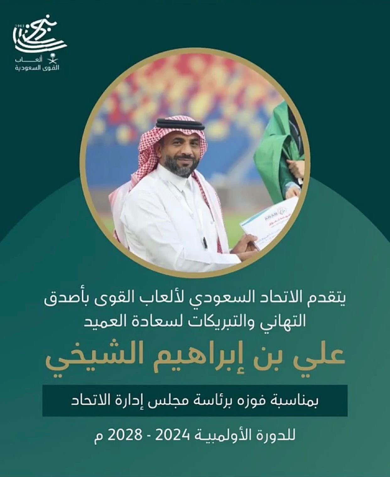 وقدم الاتحاد السعودي لألعاب القوى بأصدق التهاني والتبريكات لسعادة العميد علي الشيخي بمناسبة فوزه متمنين له التوفيق والنجاح في قيادة مسيرة الاتحاد نحو المزيد من الإنجازات والتميز.