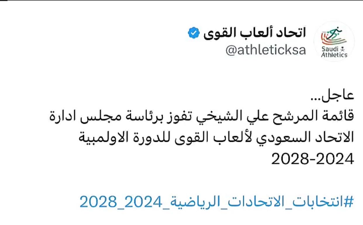 أعلن الاتحاد السعودي لألعاب القوى اليوم عبر حسابه في منصة X فوز المرشح سعادة العميد علي إبراهيم الشيخي،