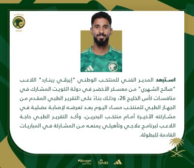 وجاء قرار رينارد بناء على تقرير طبي مقدم من الجهاز الطبي للمنتخب السعودي، الذي أكد حاجة اللاعب لبرنامج علاجي وتأهيلي بعد إصابته في مباراة البحرين الأحد والتي خسرها الفريق 2-3 في مستهل مشواره بالبطولة.