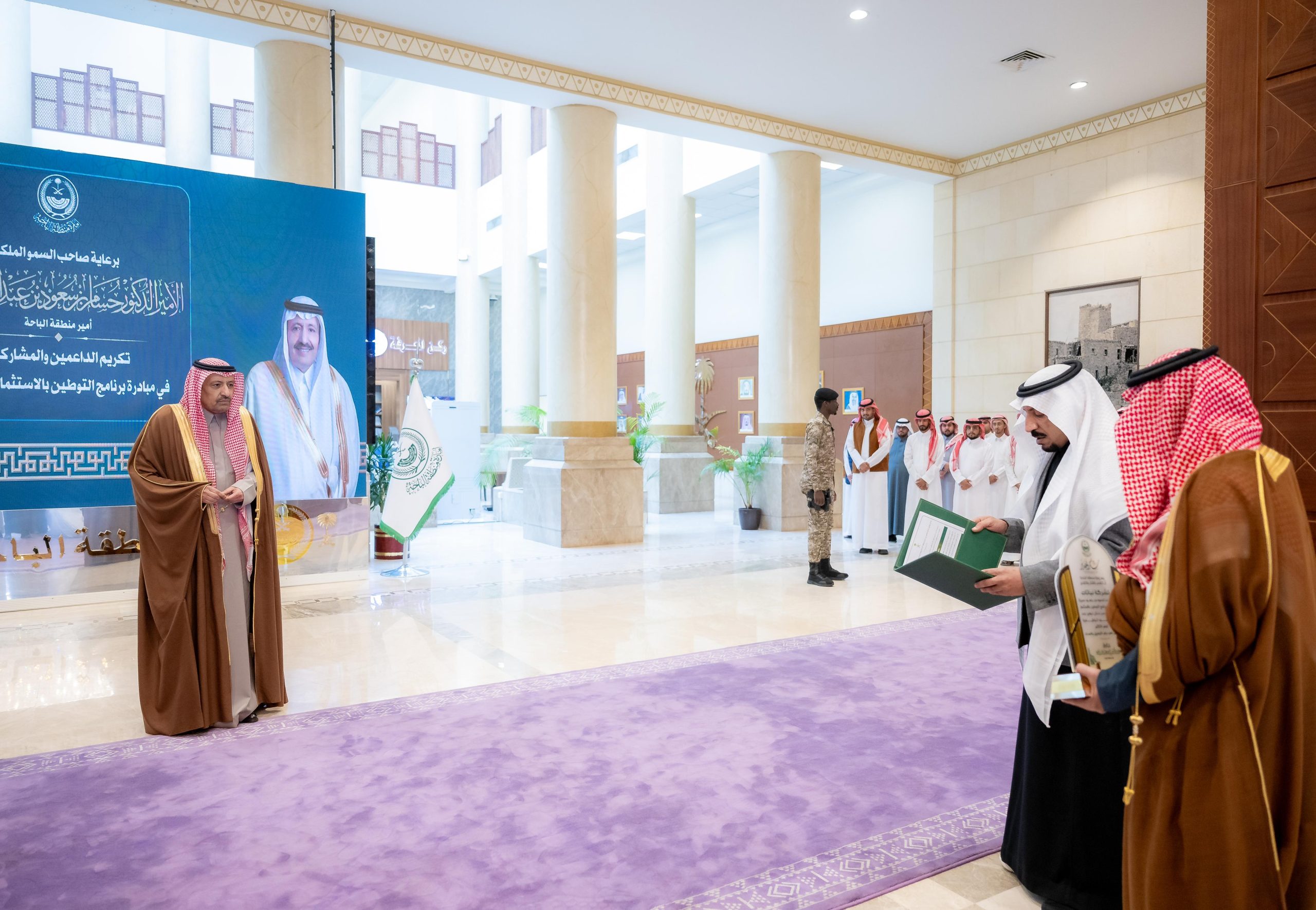 الباحة – كرّم صاحب السمو الملكي الأمير الدكتور حسام بن سعود بن عبدالعزيز، أمير منطقة الباحة، الجهات الداعمة لمبادرة التوطين بالاستثمار الاجتماعي، تقديرًا لدورها في تنفيذ البرنامج الذي استهدف توطين وتوظيف عدد من أبناء وبنات المنطقة حديثي التعيين في مجالات مهنية متنوعة.