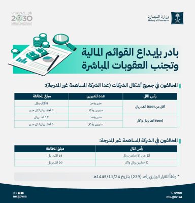 حثت وزارة التجارة المديرين في الشركات أو رئيس مجلس إدارتها بالالتزام بإيداع قوائمها المالية وفقًا لأحكام نظام الشركات ولائحته التنفيذية وتجنب العقوبات المباشرة التي نص عليها القرار الوزاري بتاريخ 24 / 11 / 1445هـ على كل من أخلّ بإيداع القوائم المالية وأوضحت أن نظام الشركات نص في المادة (17) على “وجوب إعداد قوائم مالية للشركة في نهاية كل سنة مالية وفق المعايير المحاسبية المعتمدة في المملكة وإيداعها خلال (6) أشهر من تاريخ انتهاء السنة المالية” ونص القرار الوزاري على إيقاع عقوبة مباشرة على كل من أخلّ بإيداع القوائم المالية وفقاً لأحكام نظام الشركات ولائحته التنفيذية وتكون الغرامة وفقًا للآتي: المخالفون في جميع أشكال الشركات (عدا الشركة المساهمة غير المدرجة) 8 آلاف ريال على المخالف في الشركة ذات المدير الواحد التي رأس مالها يقل عن (500 ألف ريال) 4 آلاف ريال على المخالف في الشركة ذات المديرين أو أكثر التي رأس مالها يقل عن (500 ألف ريال) 12 ألف ريال على المخالف في الشركة ذات المدير الواحد التي يبلغ رأس مالها إلى (500 ألف ريال) أو أكثر 6 آلاف ريال على المخالف في الشركة ذات المديرين وأكثر التي يبلغ رأس مالها إلى (500 ألف ريال) أو أكثر والمخالفون في الشركة المساهمة غير المدرجة 15 ألف ريال على المخالف إذا كان رأس مال الشركة أقل من (5 ملايين ريال) 20 ألف ريال على المخالف إذا كان رأس مال الشركة (5 ملايين ريال) فأكثر ونص القرار على أنه في حال تكرار مخالفة عدم إيداع القوائم المالية خلال المدة النظامية للسنة المالية اللاحقة لقرار المخالفة السابق مكتسب القطعية فيتم زيادة الغرامة بنسبة (50%) .
