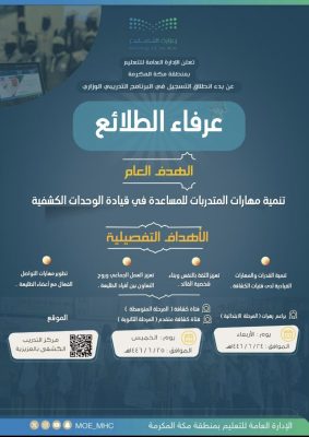 إدارة تعليم ” مكة ” أوضحت أن برنامج التدريبي الوزاري (عرفاء الطلائع) يهدف إلى تنمية مهارات المتدربات للمساعدة في قيادة الوحدات الكشفية ، كذلك تنمية القدرات والمهارات القيادية لدى فتيات الكشافة ، وتعزيز الثقة بالنفس وبناء شخصية القائدة، وتعزيز العمل الجماعي، وروح التعاون بين أفراد الطليعة ، وتطوير مهارات التواصل الفعال مع أعضاء الطليعة .