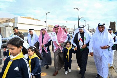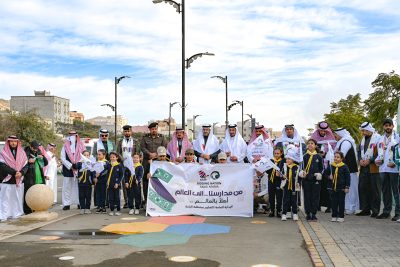 انطلقت الفعاليات بمسيرة رياضية من ممشى الحاوية إلى قاعة الأمير فيصل التعليمية بمبنى الإدارة، حيث شارك وكيل الإمارة المساعد ومدير التعليم ومديرو الجهات الحكومية الطلاب والطالبات احتفالهم بهذا الإنجاز التاريخي. وعند الوصول إلى القاعة، قدم طلاب وطالبات المدارس “أوبريت أهلا بالعالم”، الذي تضمن لوحات فنية مميزة تغنت بالوطن ونهضته المستدامة التي شملت كافة المجالات، بما في ذلك المجال الرياضي.