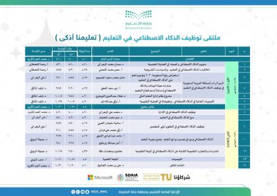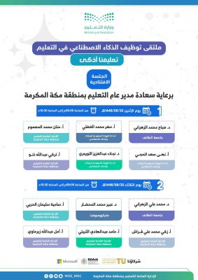 عقدت الإدارة العامة للتعليم بمنطقة مكة المكرمة ملتقى توظيف الذكاء الاصطناعي في التعليم ” تعليمنا أذكى “، وذلك بالشراكة مع كل من الهيئة السعودية للبيانات والذكاء الاصطناعي (سدايا)، وجامعة الطائف ، وشركة مايكروسوفت يومي الاثنين والثلاثاء 29- 1443/6/30هـ (عن بعد) عبر برنامج التيمز والذي شهد حضور أكثر من 7000 من شاغلي الوظائف التعليمية.