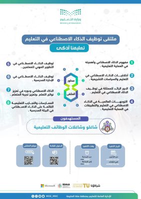 هذا وناقش الملتقى في اليوم الأول “مفهوم الذكاء الاصطناعي وأهميته في العملية التعليمية” من تقديم الدكتورة صباح الزهراني ، عقبها “أخلاقيات الذكاء الاصطناعي في التعليم و السياسات التشريعية” والتي عرضتها الأستاذة مضر الفضلي، فيما تم تسليط الضوء على الدور الرائد للمملكة العربية السعودية في توظيف الذكاء الاصطناعي في التعليم حيث استعرضت الأستاذة حنان المصموم “رؤية السعودية 2030م وتوجهها نحو تبني الذكاء الاصطناعي في التعليم” ، وبدورها قدمت الأستاذة نهى الحجي من خلال ورقتها “مبادرات هيئة البيانات و الذكاء الاصطناعي (سدايا ) لدعم قطاع التعليم” ، تلا ذلك “مشروع نظام إدارة التعليم الذكي” للدكتور نجلاء التويجري ، عقبها ورقة بعنوان “التوجهات العالمية في الذكاء الاصطناعي وتطبيقاته في العملية التعليمية”قدمها الأستاذ تركي نتو .وقد اختتم الملتقى بفتح باب الحوار والمداخلات والرد على الاستفسارات .