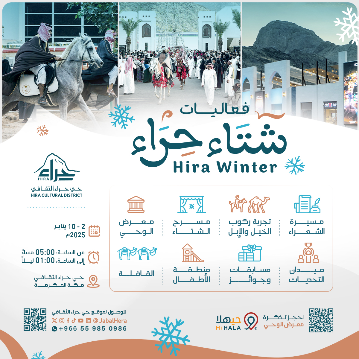 يستعد حي حراء الثقافي في مكة المكرمة لإحياء فعالياته الشتوية المجانية بالتزامن مع إجازة منتصف العام، التي تبدأ من 2 إلى 10 يناير الحالي، وذلك في سبيل إثراء جودة الحياة من خلال إبرازها بشكل متجدد للزوار والساكنين من مختلف الجنسيات وشرائح المجتمع المختلفة بمكة المكرمة.